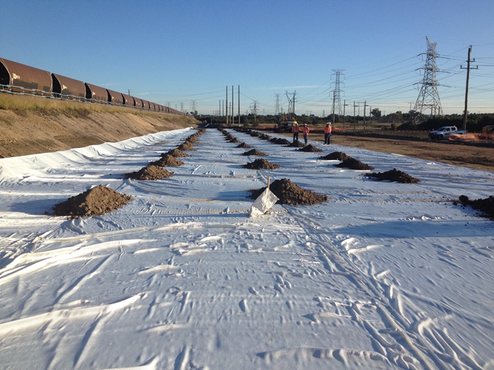 在施工中,土工膜上方采用天然搭接接縫,土工膜上方采用接縫或熱風焊接。熱風焊接的首選方法是加入燈絲土工織物,也就是說,熱風槍的兩塊布加入高溫加熱的時刻,所以它的一些達到熔融狀態,并立即使用某些外力使它牢固粘合在一起